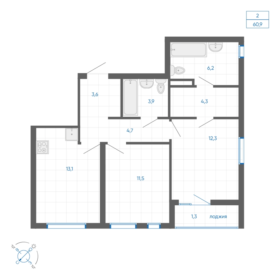 • Общая площадь60.90