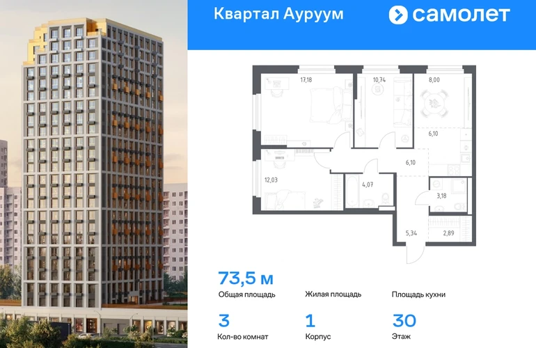 Строим кварталы для жизни с заботой о будущем. Предлагается 3-комнатная квартира бизнес-класса 73,5 кв.м в корпусе 1 на 30 этаже, в ЖК «Квартал Ауруум» Квартира с предчистовой отделкой. Доступность дополнительных опций уточняйте у застройщика. Приобрести квартиру возможно по специальным акциям от застройщика, с текущими условиями акций можно ознакомиться в блоке «Акций». Цена динамическая и может отличаться, уточняйте актуальность у застройщика. «Квартал Ауруум» — это море зелени под вашими окнами и жизнь в уютном квартале с собственной инфраструктурой. До центра города — всего 15 минут на авто. Жилой квартал находится в развитом районе, где все необходимое рядом — свой детский сад, магазины, кафе и школа — через дорогу. 4 разновысотных корпуса, от 14 до 31 этажа, дарят ощущение простора и много естественного света в квартирах. Для неспешных прогулок - приватный двор-сад или Основинский парк у подножия комплекса. Для авто — подземный паркинг. Все квартиры с предчистовой отделкой.#yan19-2r1810428#О застройщике