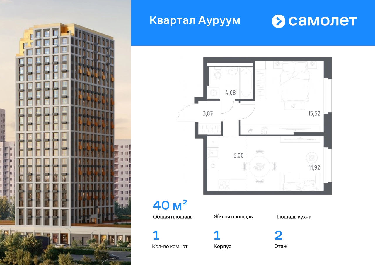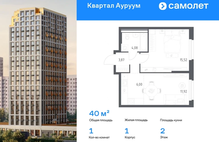Строим кварталы для жизни с заботой о будущем. Предлагается 1-комнатная квартира бизнес-класса 40 кв.м в корпусе 1 на 2 этаже, в ЖК «Квартал Ауруум» Квартира с предчистовой отделкой. Доступность дополнительных опций уточняйте у застройщика. Приобрести квартиру возможно по специальным акциям от застройщика, с текущими условиями акций можно ознакомиться в блоке «Акций». Цена динамическая и может отличаться, уточняйте актуальность у застройщика. «Квартал Ауруум» — это море зелени под вашими окнами и жизнь в уютном квартале с собственной инфраструктурой. До центра города — всего 15 минут на авто. Жилой квартал находится в развитом районе, где все необходимое рядом — свой детский сад, магазины, кафе и школа — через дорогу. 4 разновысотных корпуса, от 14 до 31 этажа, дарят ощущение простора и много естественного света в квартирах. Для неспешных прогулок - приватный двор-сад или Основинский парк у подножия комплекса. Для авто — подземный паркинг. Все квартиры с предчистовой отделкой.#yan19-2r1812271#О застройщике