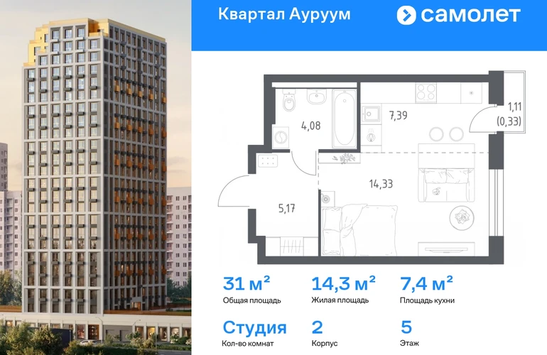 Строим кварталы для жизни с заботой о будущем. Предлагается квартира студия бизнес-класса 31 кв.м в корпусе 2 на 5 этаже, в ЖК «Квартал Ауруум» Квартира с предчистовой отделкой. Доступность дополнительных опций уточняйте у застройщика. Приобрести квартиру возможно по специальным акциям от застройщика, с текущими условиями акций можно ознакомиться в блоке «Акций». Цена динамическая и может отличаться, уточняйте актуальность у застройщика. «Квартал Ауруум» — это море зелени под вашими окнами и жизнь в уютном квартале с собственной инфраструктурой. До центра города — всего 15 минут на авто. Жилой квартал находится в развитом районе, где все необходимое рядом — свой детский сад, магазины, кафе и школа — через дорогу. 4 разновысотных корпуса, от 14 до 31 этажа, дарят ощущение простора и много естественного света в квартирах. Для неспешных прогулок - приватный двор-сад или Основинский парк у подножия комплекса. Для авто — подземный паркинг. Все квартиры с предчистовой отделкой.#yan19-2r1824453#О застройщике