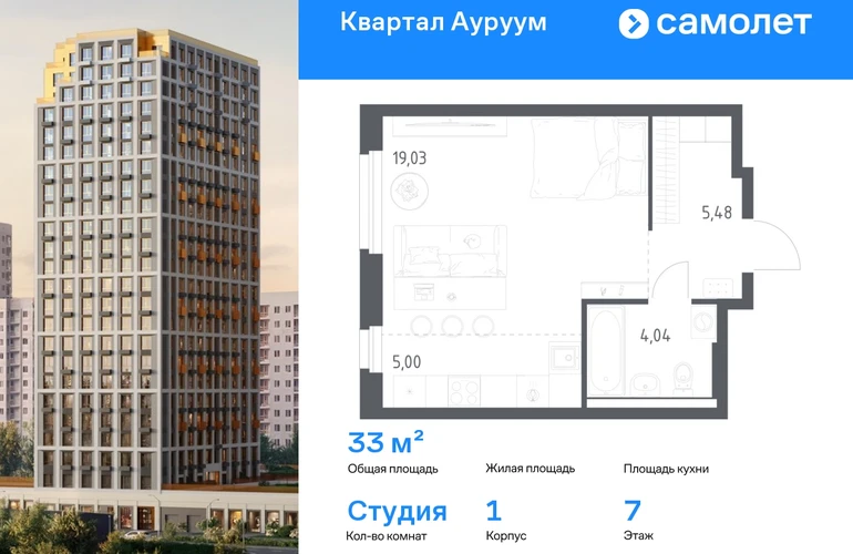 Строим кварталы для жизни с заботой о будущем. Предлагается квартира студия бизнес-класса 33 кв.м в корпусе 1 на 7 этаже, в ЖК «Квартал Ауруум» Квартира с предчистовой отделкой. Доступность дополнительных опций уточняйте у застройщика. Приобрести квартиру возможно по специальным акциям от застройщика, с текущими условиями акций можно ознакомиться в блоке «Акций». Цена динамическая и может отличаться, уточняйте актуальность у застройщика. «Квартал Ауруум» — это море зелени под вашими окнами и жизнь в уютном квартале с собственной инфраструктурой. До центра города — всего 15 минут на авто. Жилой квартал находится в развитом районе, где все необходимое рядом — свой детский сад, магазины, кафе и школа — через дорогу. 4 разновысотных корпуса, от 14 до 31 этажа, дарят ощущение простора и много естественного света в квартирах. Для неспешных прогулок - приватный двор-сад или Основинский парк у подножия комплекса. Для авто — подземный паркинг. Все квартиры с предчистовой отделкой.#yan19-2r1824464#О застройщике